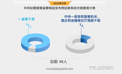 2025年8月,中央纪委国家监委网站共发布48名党员领导干部党纪政务处分信息。其中,中央一级党和国家机关、国企和金融单位厅局级干部2人,省管干部46人。
