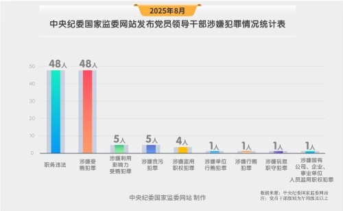 2025年8月,中央纪委国家监委网站发布的党纪政务处分信息中,48名被处分的党员领导干部均构成严重职务违法,48人均被指涉嫌受贿犯罪,5人被指涉嫌贪污犯罪,5人被指涉嫌利用影响力受贿犯罪,4人被指涉嫌滥用职权犯罪,另外各有1人被指涉嫌行贿犯罪,单位行贿犯罪,玩忽职守犯罪,国有公司、企业、事业单位人员滥用职权犯罪。