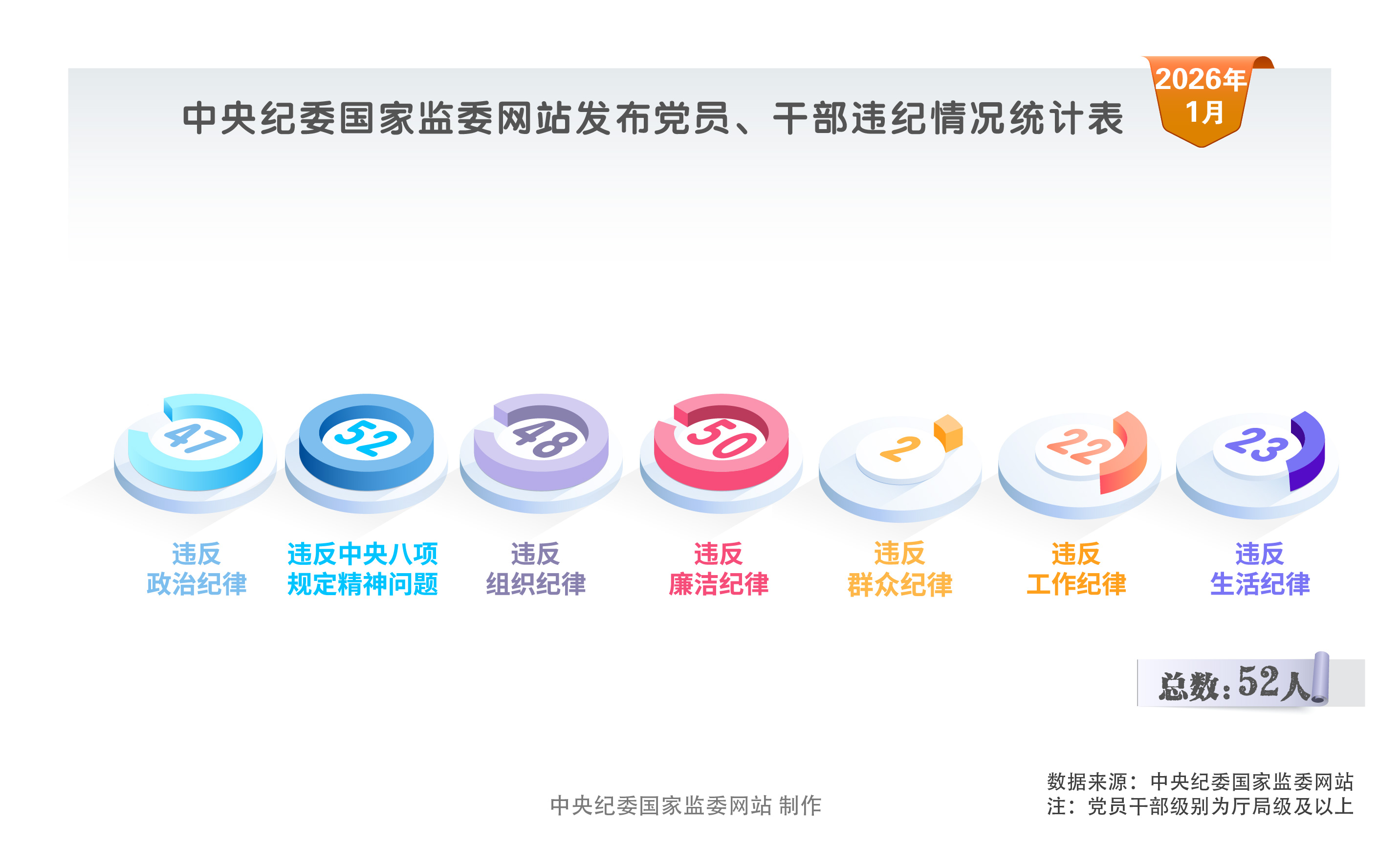2026年1月,中央纪委国家监委网站发布的52条党纪政务处分信息中,47人违反政治纪律,52人违反中央八项规定精神,48人违反组织纪律,50人违反廉洁纪律,2人违反群众纪律,22人违反工作纪律,23人违反生活纪律。