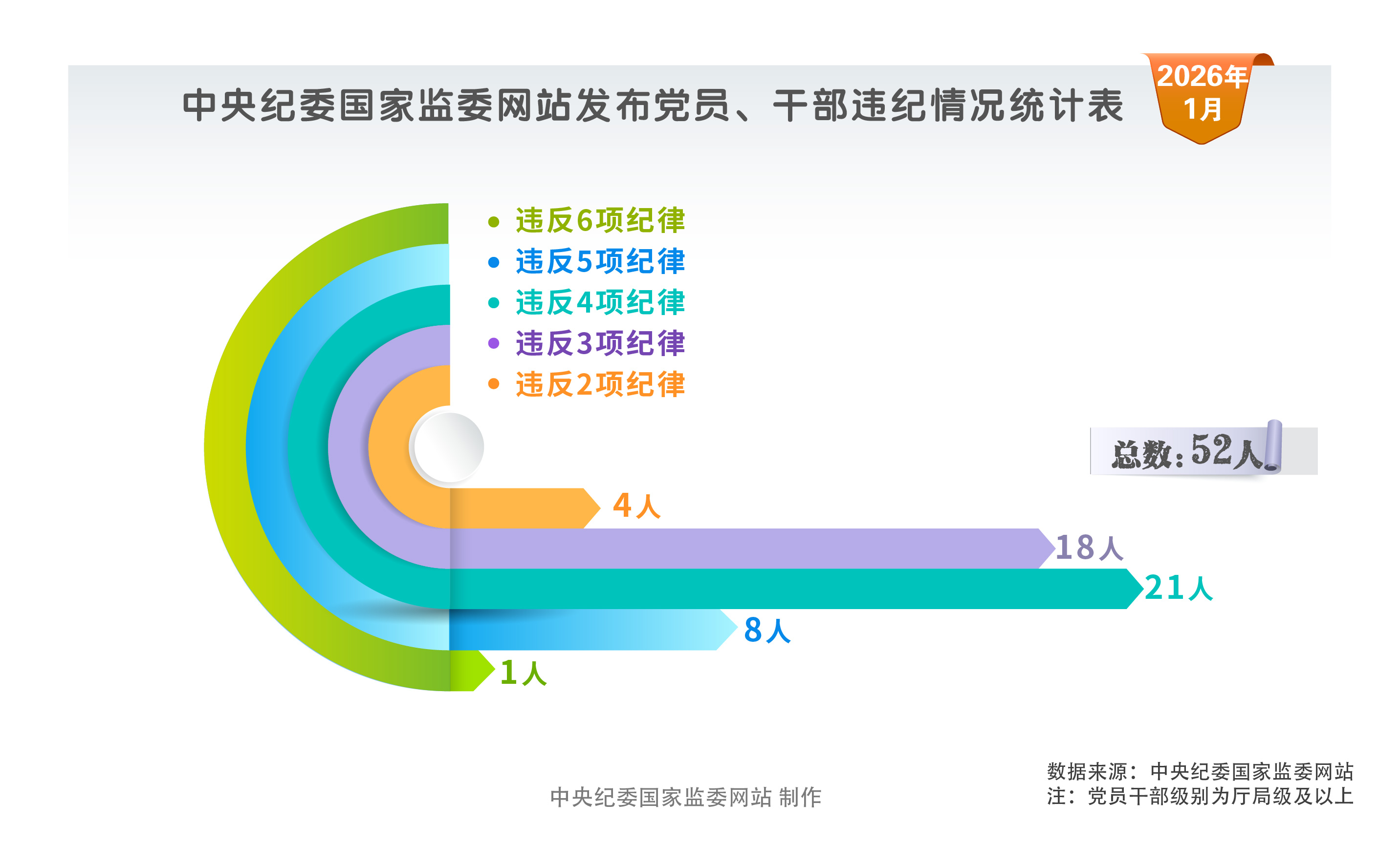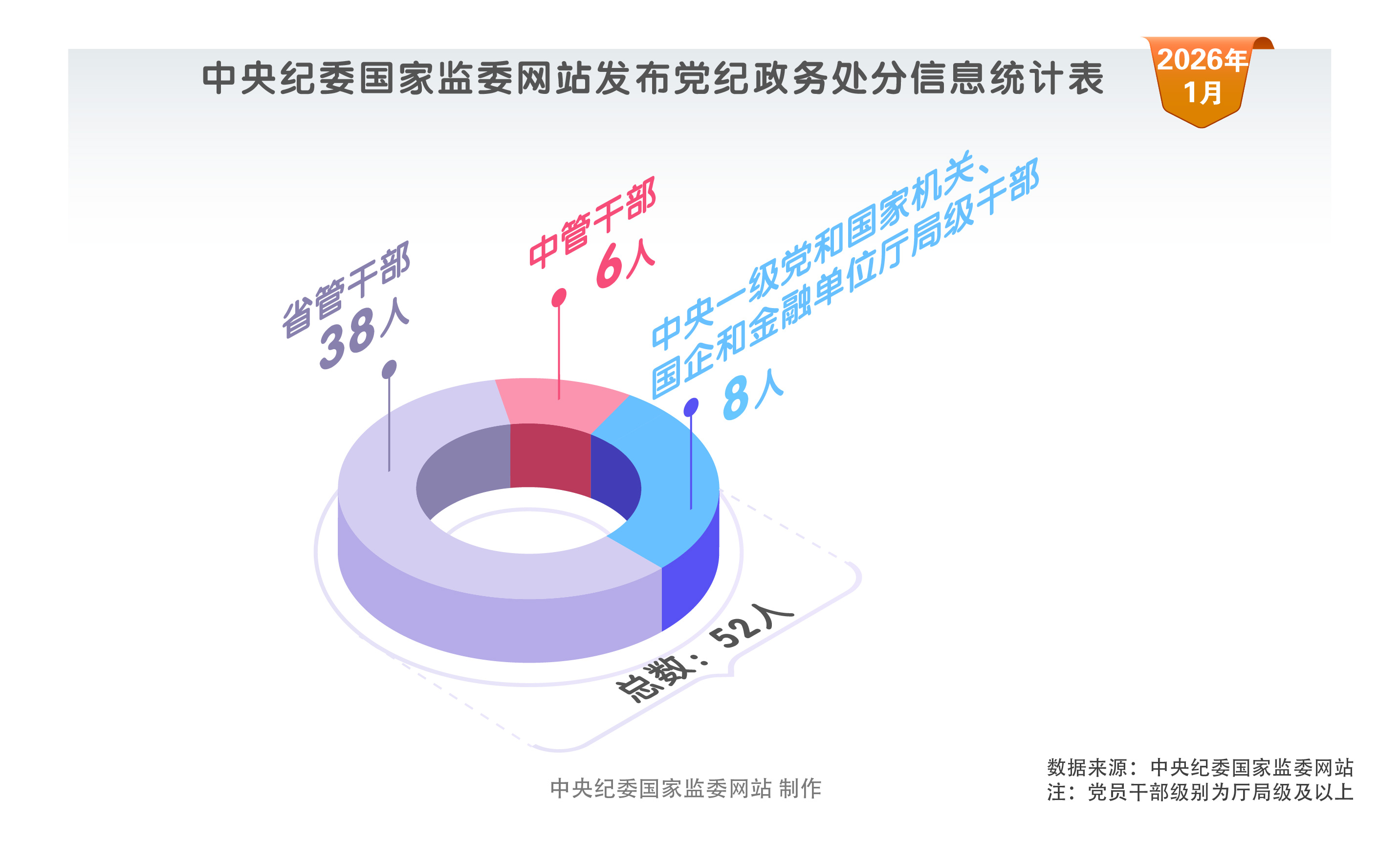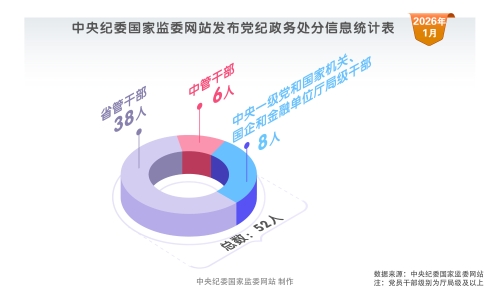 2026年1月,中央纪委国家监委网站共发布52条党纪政务处分信息。其中,中管干部6人,中央一级党和国家机关、国企和金融单位厅局级干部8人,省管干部38人。