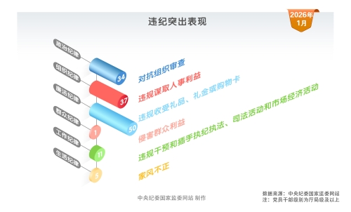2026年1月,中央纪委国家监委网站通报的52名被处分党员、干部中,有47人存在违反政治纪律问题,其中34人存在对抗组织审查行为;在违反组织纪律行为中,违规谋取人事利益占比最高,有37人存在该违纪行为;违反廉洁纪律的50人均存在违规收受礼品、礼金或购物卡的行为;在违反工作纪律行为中,违规干预和插手执纪执法、司法活动和市场经济活动是突出违纪表现。